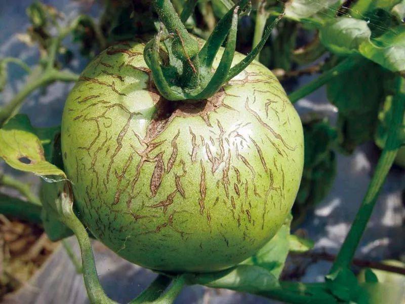 菜农朋友在蔬菜日常生产和栽培管理过程中,为了增加棚内通风透光性,提高果实的着色程度而过度疏除叶片。菜农只留下上部几片叶片,下部的叶片一概疏除,功能叶片不足,制造的光合产物不足,果实得不到充足的营养而表现裂果现象。